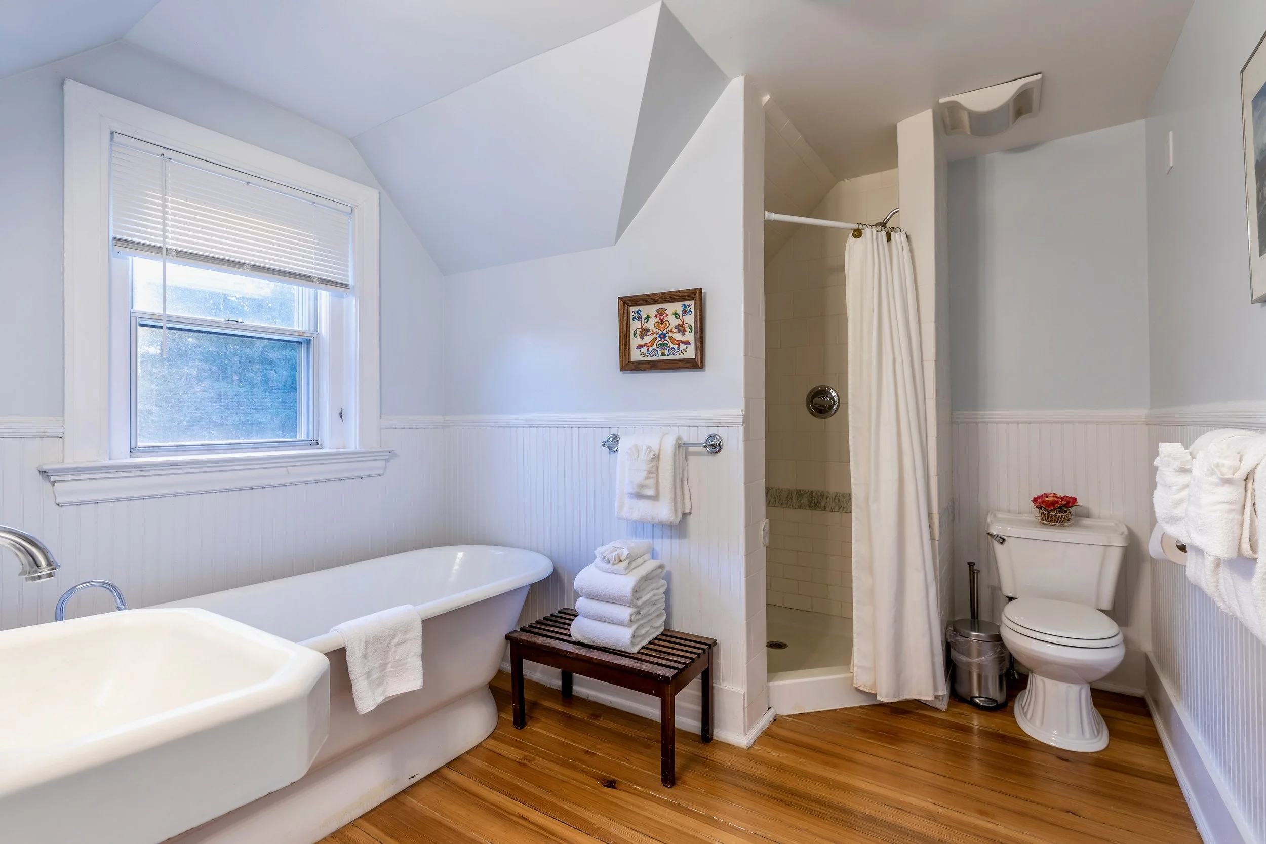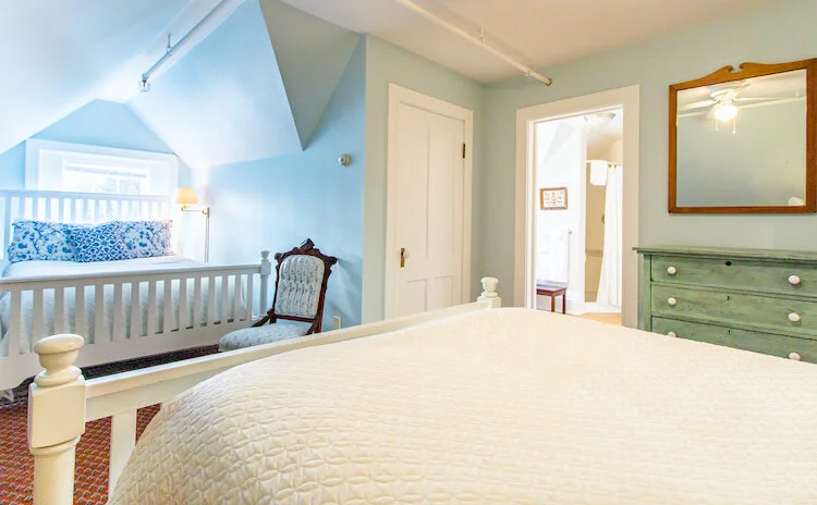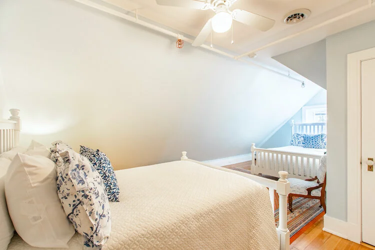 2 double beds in a room with eves. Lovely ensuite bathroom with a tub and separate shower. 3rd floor.