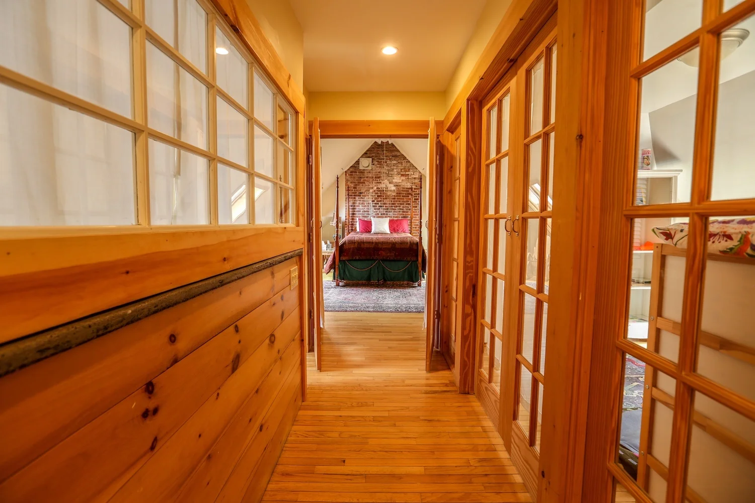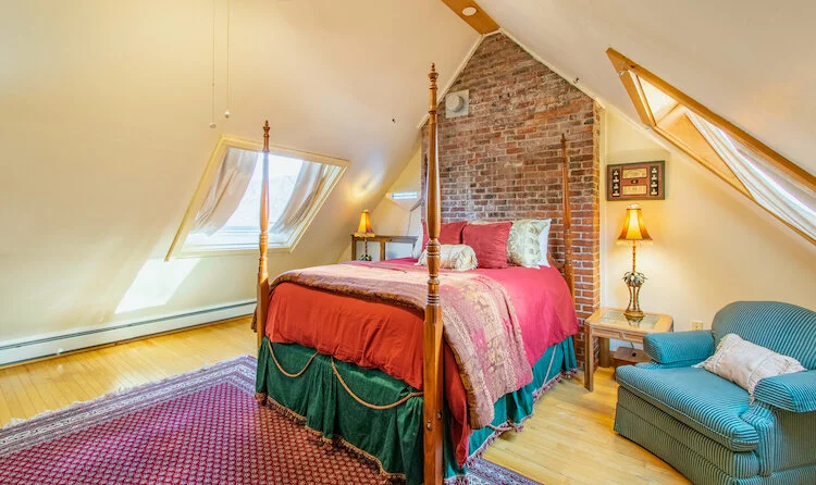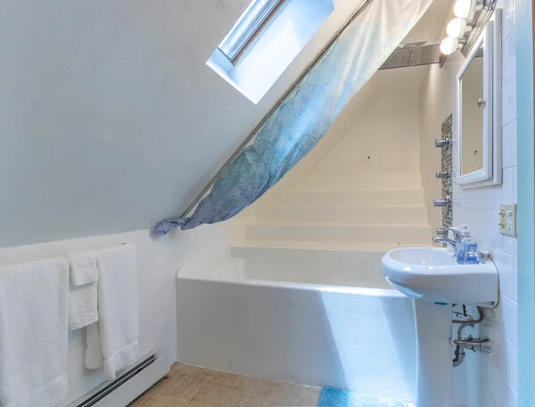 This spacious and bright queen bedroom has a high for poster bed. It shares the bath in the hall with rooms 11 and 12. Great for families and teachers on retreats.