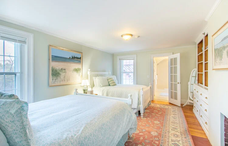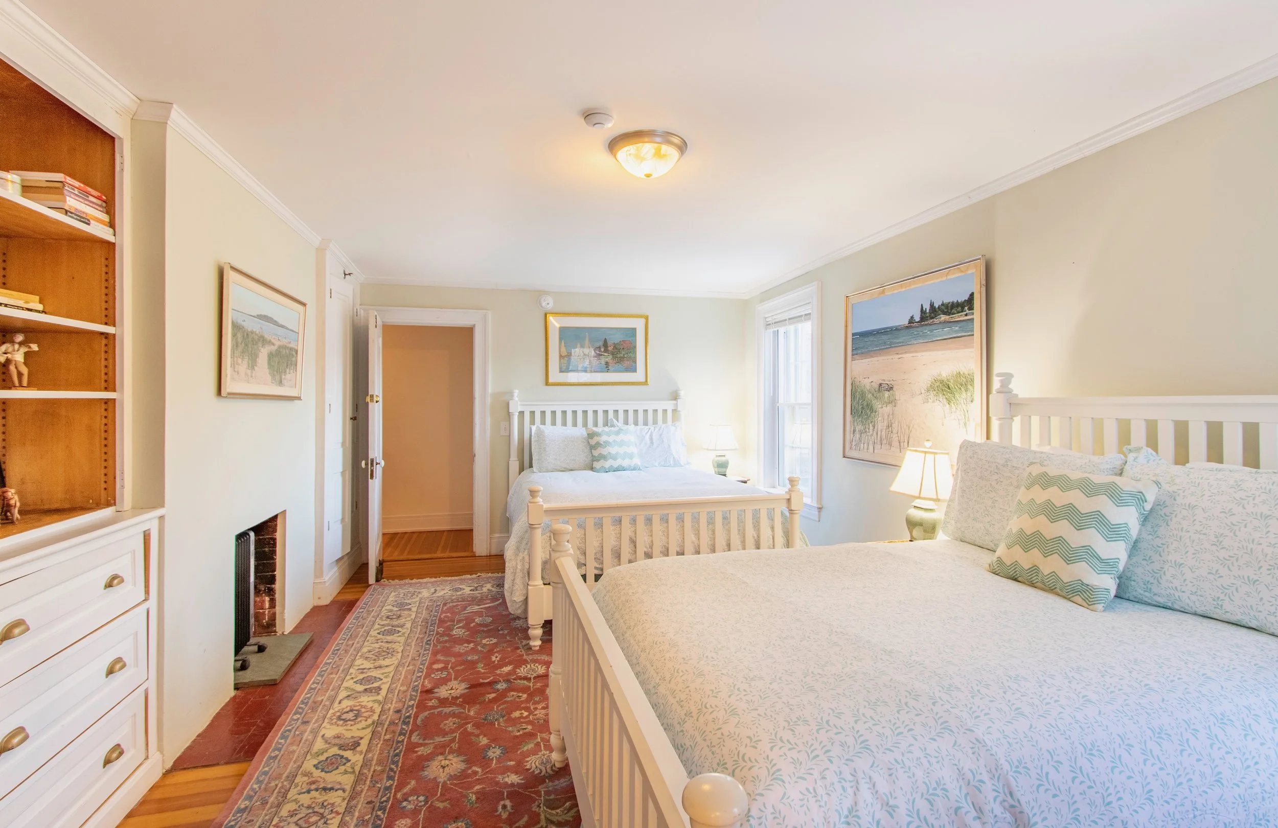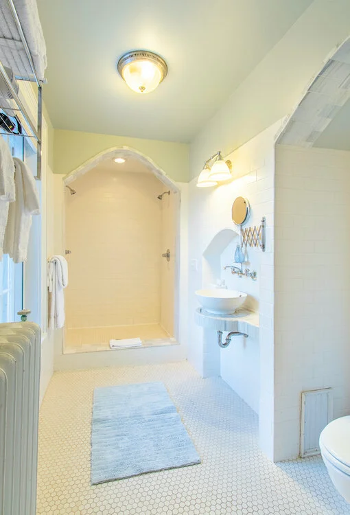 This large room has 1 queen and 1 double bed. Wonderful spa ensuite bathroom with double headed shower trimmed in Vermont marble.