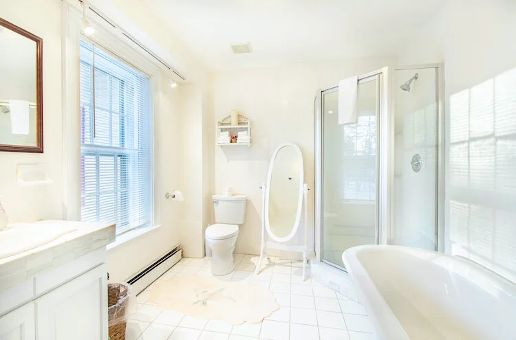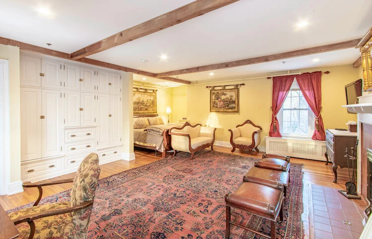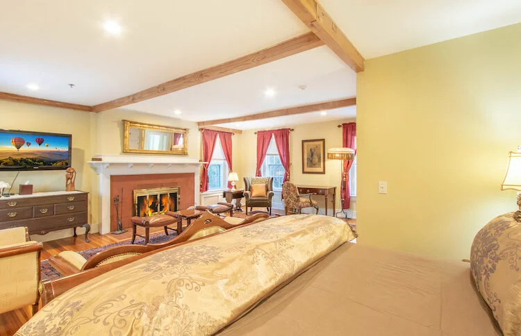 This enormous room has a wood burning fireplace, king bed, and separate sitting room. Private bathroom with a clawed foot tub and separate shower. 2nd floor.