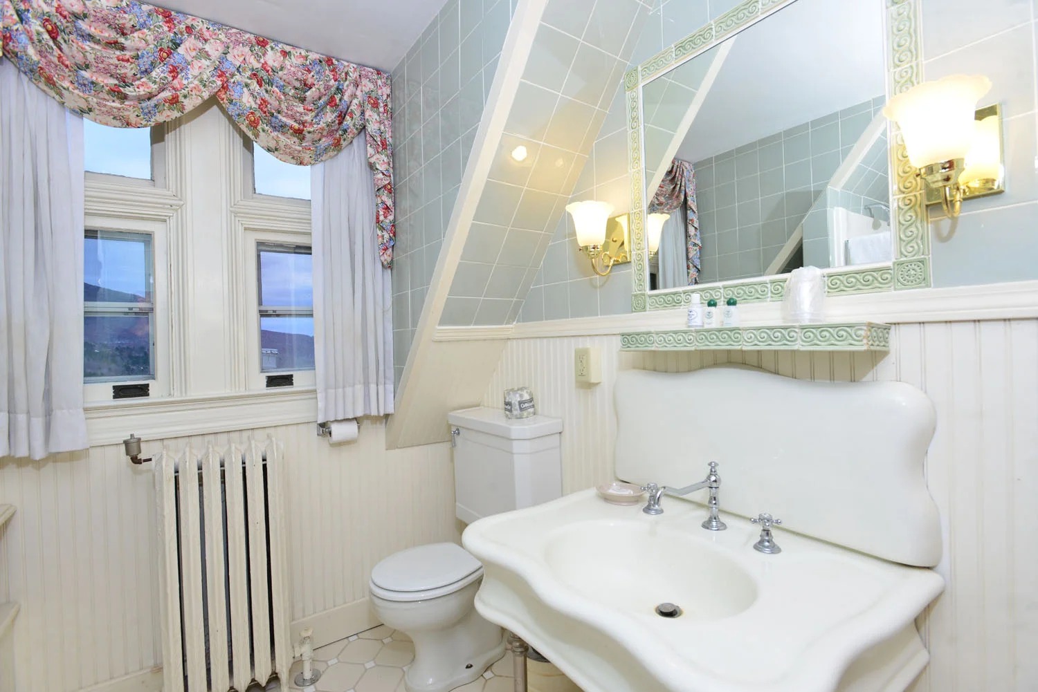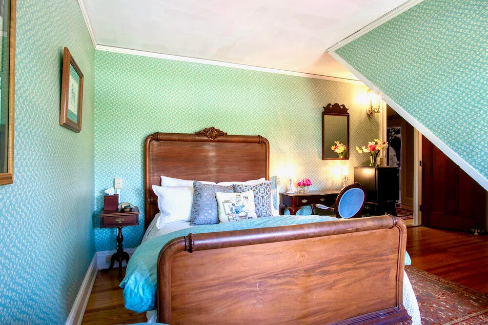 This gabled room evokes the charm of a Norman Rockwell painting. Rockwell lived in the neighboring town of Arlington, Vermont from 1939 to 1953. He painted our housekeeper, Lucille Holton, who graced the cover of the Saturday Evening Post as the iconic red haired babysitter whose pigtails are being yanked by a baby. This room features a beautifully carded, double sized sleigh bed. Private bathroom with a shower and marble sink is located across the hall. 3rd floor. 110 square feet.