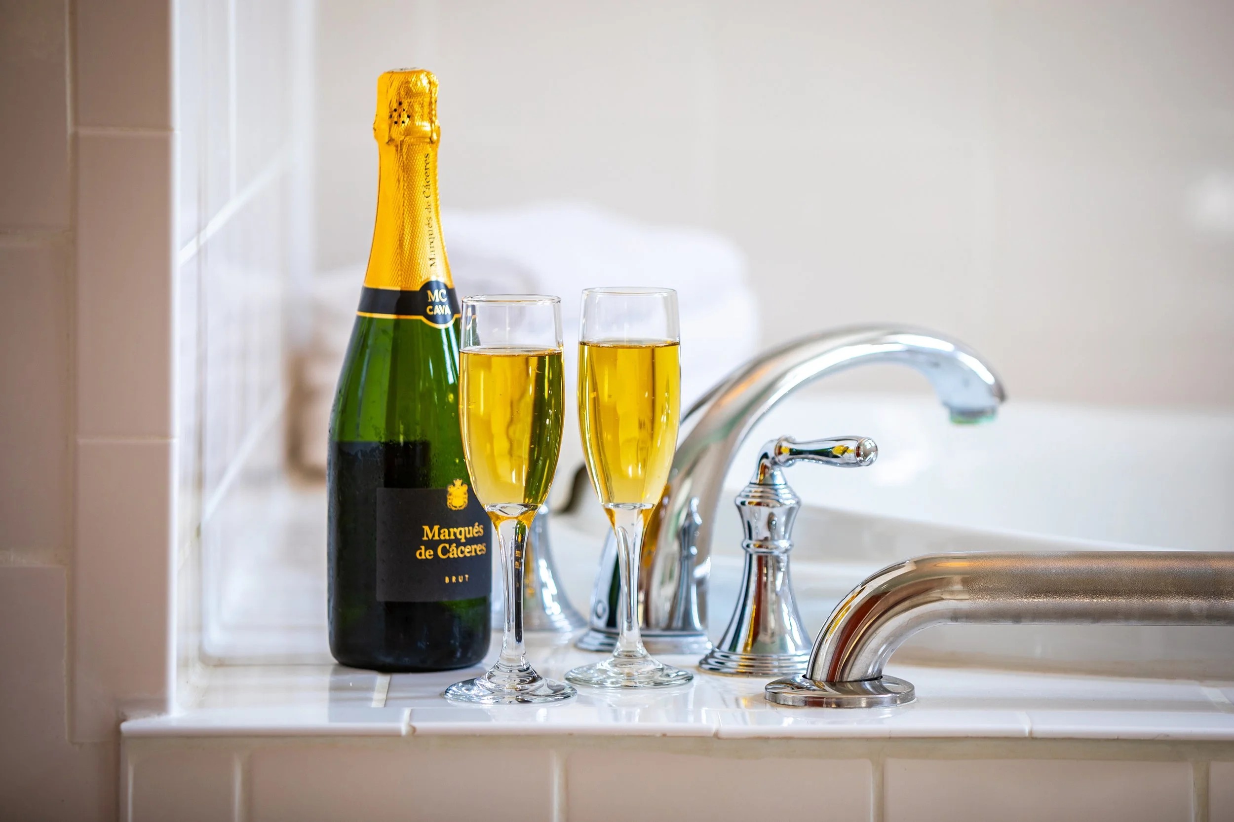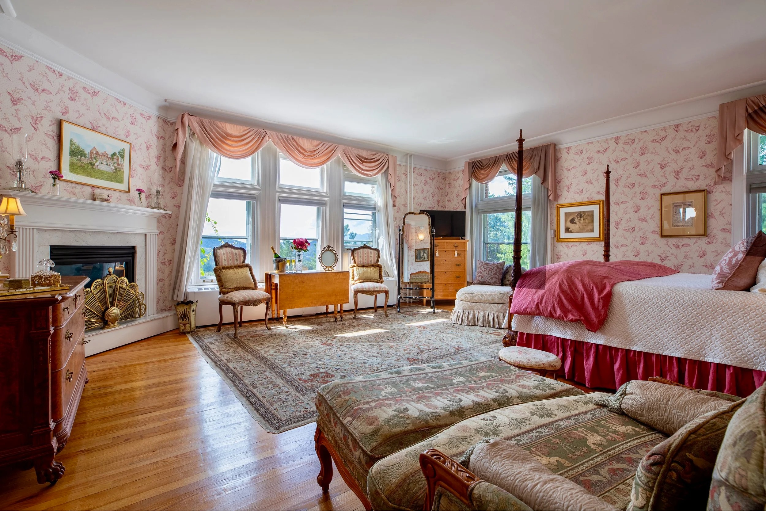 This sumptuous, sun-drenched suite is named for innkeeper Georgette "Gorgeous" Wasserstein Levis who turned The Wilburton into the premier destination for Vermont weddings. Georgette was married at the Plaza Hotel in New York City, but felt it was too impersonal, so she ensured that every Wilburton bride felt like the star of the Wilburton. This romantic room features a high carved king bed, marble gas fireplace, antique maple furnishings and oversized chaise lounges to bask in the spectacular views. New spa bathroom with jacuzzi for two and Roman shower. 2nd floor. 400 square feet.