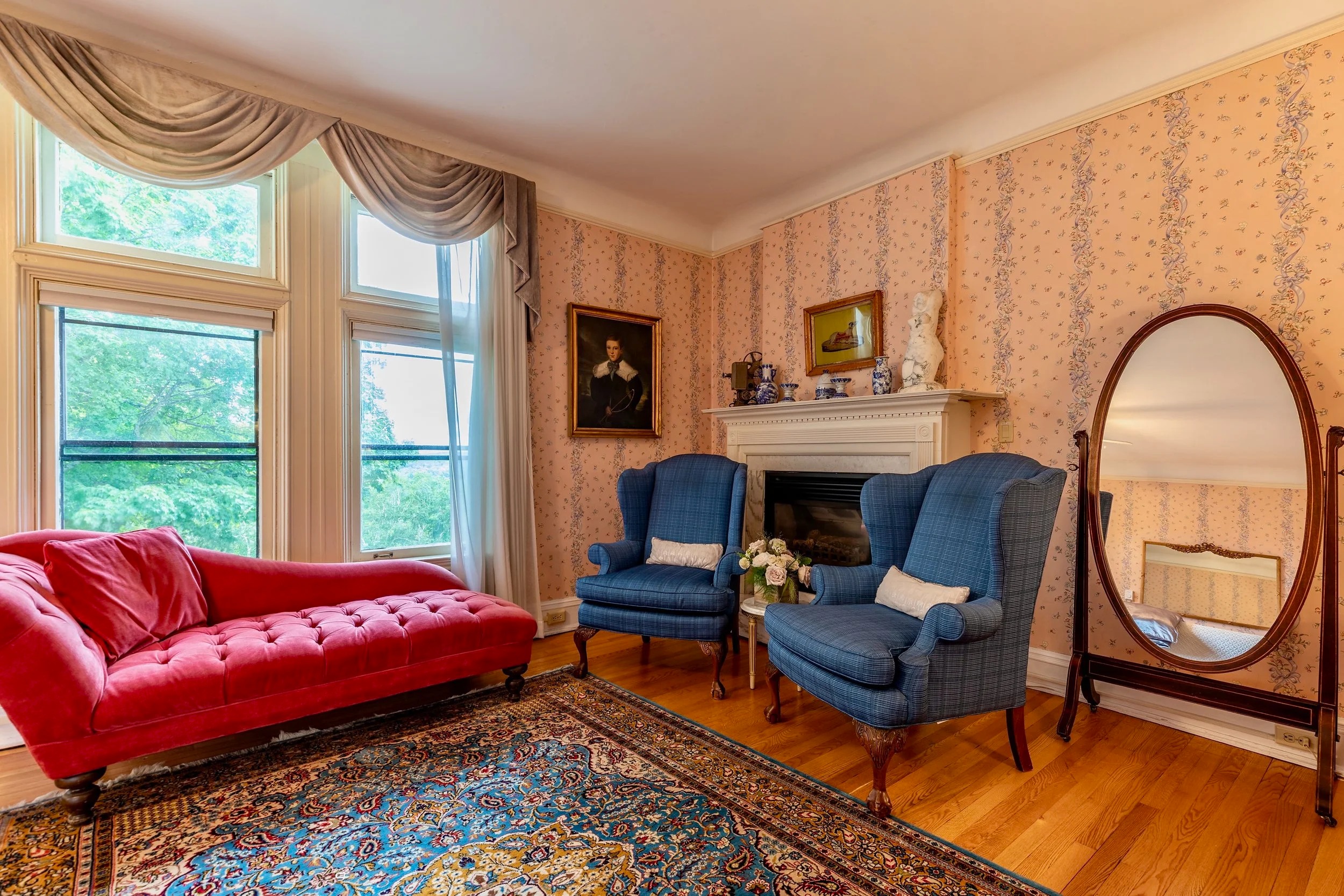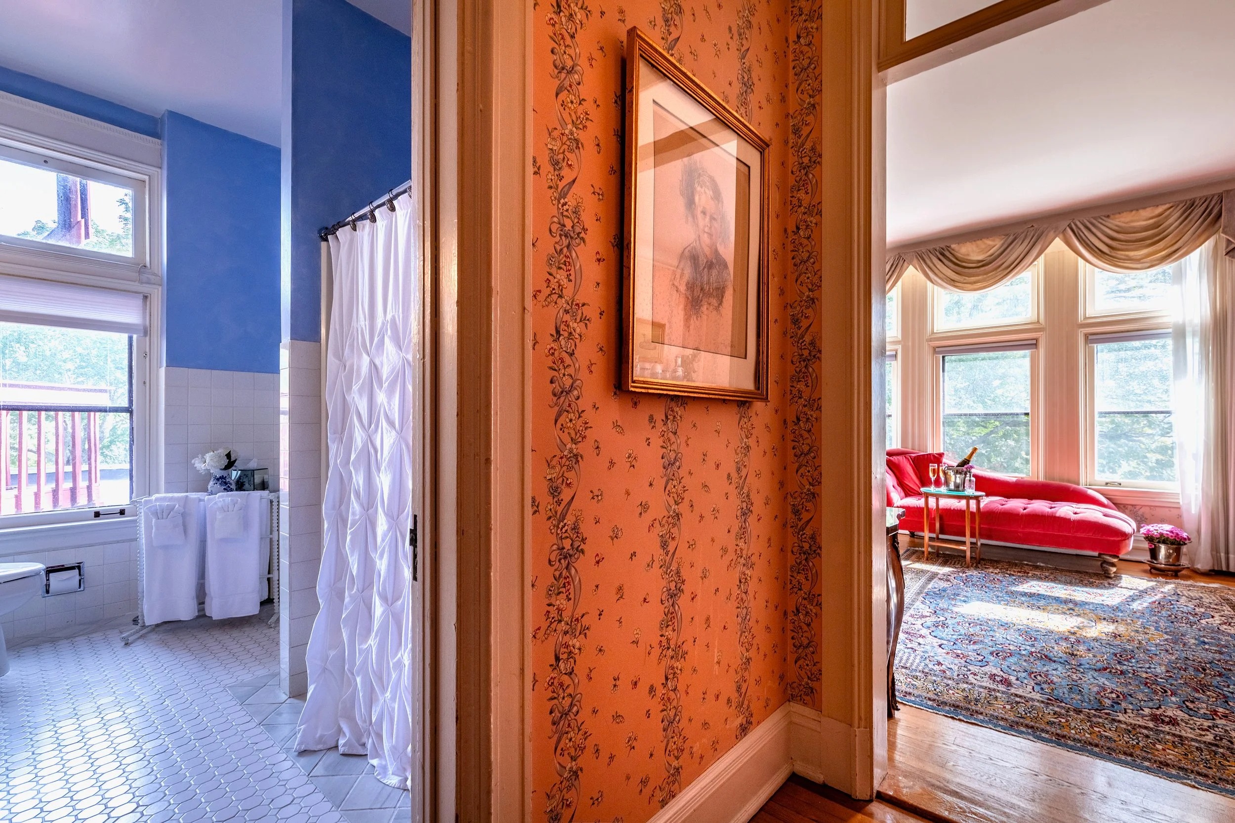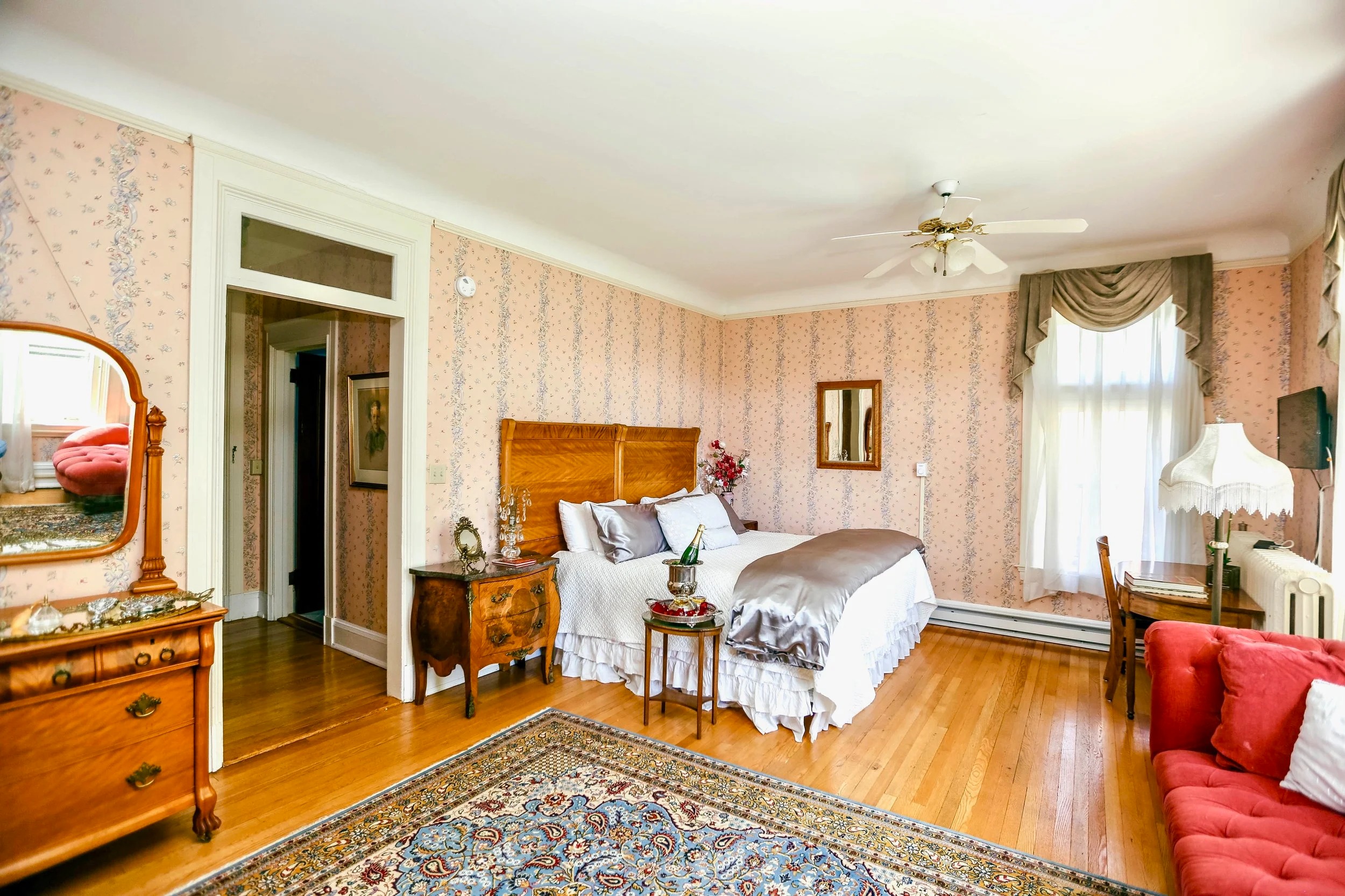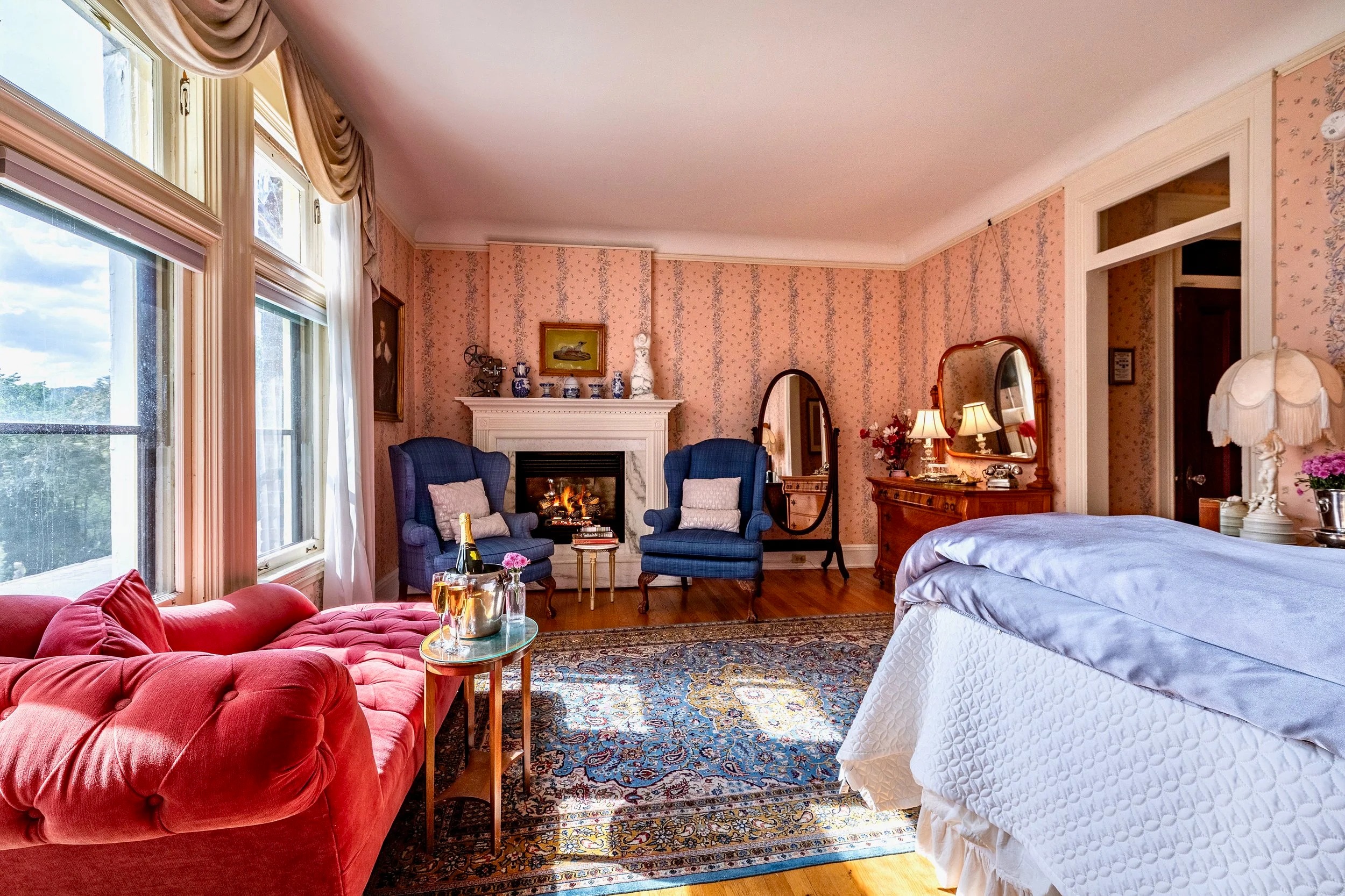 This glamorous king suite evokes the elegant era when RKO Pictures owned The WIlburton. The movie studio bought the inn as a secluded getaway for executives retreats and celebrity rendezvous. Joan Fontaine summered here for many years. You will feel like a star, lounging on the red velvet chaise lounge, drinking in the spectacular Vermont valley views. This spacious room features an antique birds-eye maple king bed, marble gas fireplace and dramatic views of the valley. Large ensuite bathroom with bathtub/shower. 2nd floor. 300 square feet.
